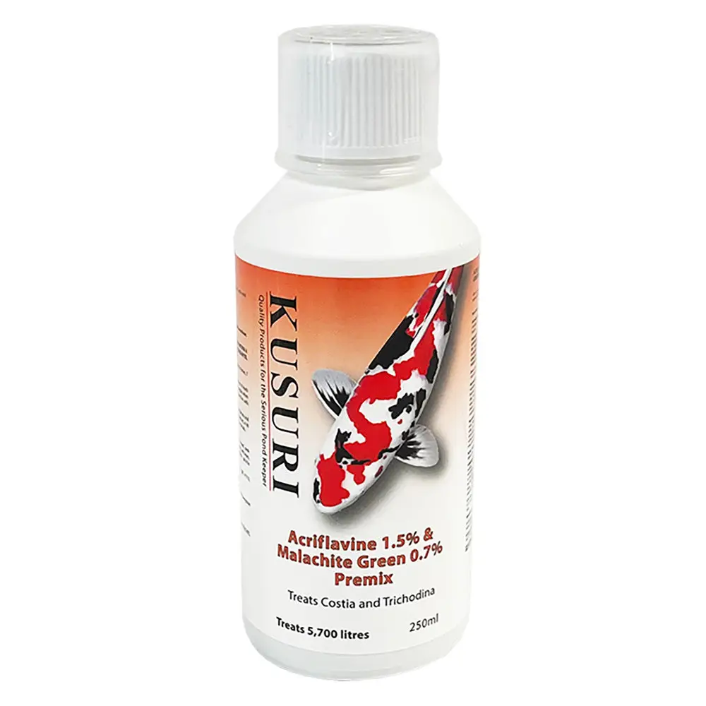 Kusuri Acriflavine & Malachite Green Premix?is a?ready to use full strength formulation, popular as a pond-wide?anti-parasite treatment. It is particularly good for Costia and Trichodina. Please ensure that you read, understand and follow all?Health and Safety?guidelines on the bottle. Please do not eat, drink or smoke whilst handling chemicals. Wear disposable vinyl or latex gloves and appropriate eye protection.
