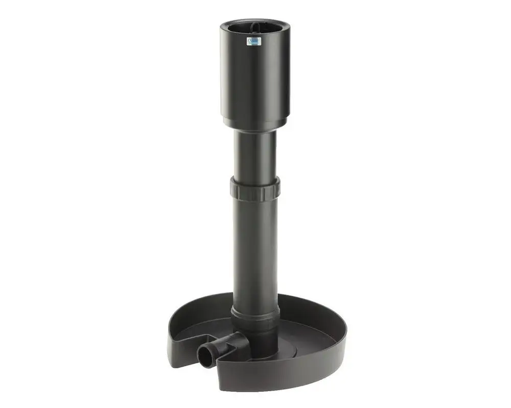 The OASE AquaSkim 20 keeps a water surface of up to 20 m? clean and is an ideal addition to the AquaMax Eco Premium models 4000-8000.?Its skimmer basket has a diameter of 126 mm.?It can be easily adapted to the pond depth thanks to the two-part telescopic tube, which is infinitely adjustable in height from 320 to 800 mm.?The skimmer compensates for water level differences of up to 100 mm.?The filter basket volume is 1.4 L. The skimmer lets through dirt particles up to 10 mm in size.?Thanks to the 350 mm base, the AquaSkim 20 can be fixed to the pond floor with stones that are particularly stable.?The small pipe diameter of 80 mm also ensures less air content and thus prevents the skimmer, which has a connection with a universal stepped hose nozzle from ? “to 1?”.