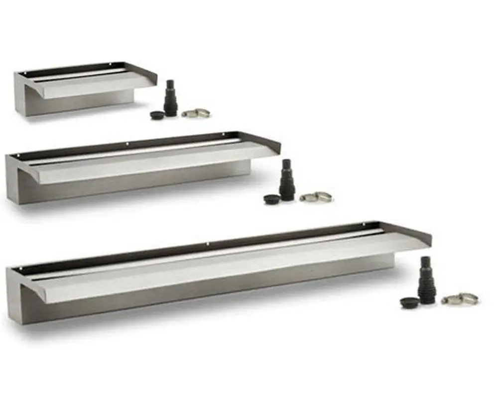 Noble and graceful waterfall 30 cm wide.?Individual waterfalls can now be designed very easily, because the robust and high-quality workmanship made of stainless steel enables both installation in a wall and screwing to a wall.?Now with a 6 cm extended exit lip for even easier installation.?The scope of delivery includes a hose nozzle and an extra flat plug.?The right pump ensures a clear and even waterfall: With a waterfall height of 0.8 m – 1.0 m = AquaMax Eco 3500 – 4000 / 0.4 m – 0.6 m = AquaMax Eco 2500 / 0.2 m = AquaMax Eco 2500. For stylish light accents in the evening, you can also install the appropriate LED waterfall lighting.?Trust in OASE quality, because you receive a 2-year guarantee.