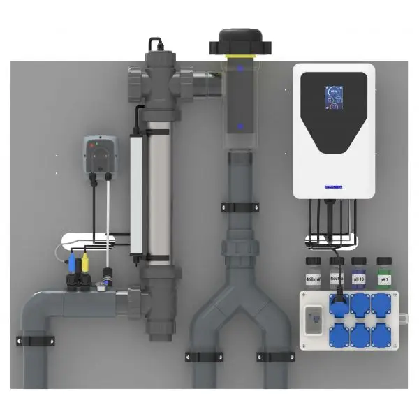 Complete pre-mounted disinfection panels for total pool water treatment. These panels fit exactly on the Plug & Play PVC panels forming a complete water treatment system! Available with Elite Connect LS60 or LS100 pool control system. Equipped with: