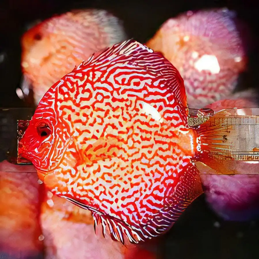 Hailing from the vibrant waters of the Amazon River basin, these breathtaking discus fish captivate enthusiasts with their striking red hues and intricate snakeskin patterns.