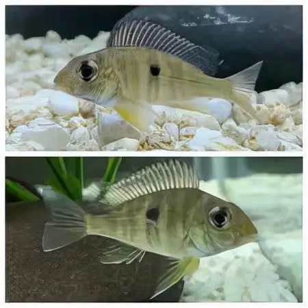 | Feeding | Flake, granules, cichlid pellets and frozen foods |