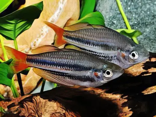 The Western Rainbowfish is known from creeks, lakes, marshy lagoons, reservoirs, rivers, and swamps. Here, it forms large aggregations along the marginal areas where there is dense vegetation and submerged logs/branches. This is a medium-sized, peaceful species that is ideally suited to planted community aquaria. The tank should be as spacious as possible, as these are fairly active fish, and they should be maintained in groups of 6 or more due to their shoaling nature. The juveniles of many rainbowfish species can often look a little drab compared to the adults, and as such are sometimes overlooked in the shops. However, once settled into the security of the planted aquarium, these young specimens will begin to colour up, gradually revealing their stunning adult beauty. Western Rainbowfish will not bother smaller tankmates, as their mouth/throat is too narrow to be able to swallow them. May also be seen on sale as the Red-tailed Rainbowfish.